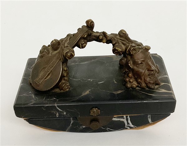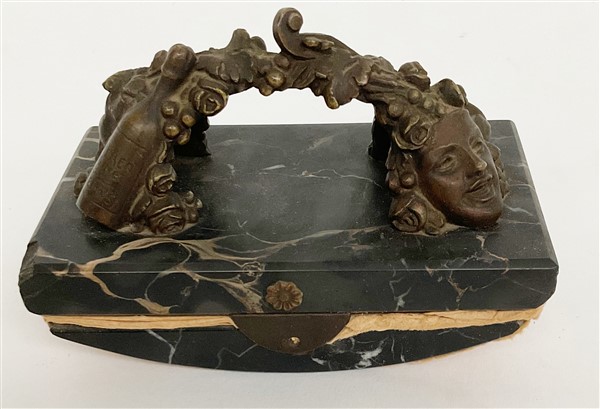Tampone asciuga inchiostro in marmo con impugnatura in bronzo raffigurante allegorie. Fine secolo XIX (cm 14x9,5x8) (difetti e mancanze)