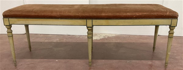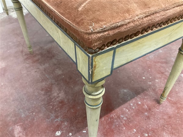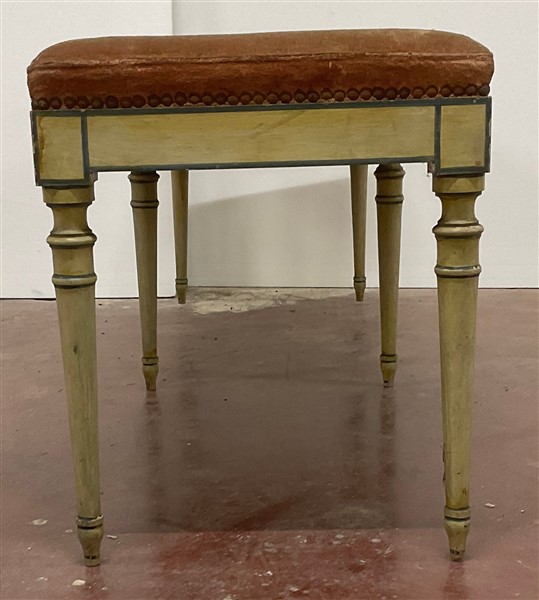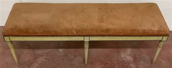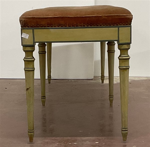 Panchetto a sei gambe tornite in legno laccato decorato con profili in verde (cm 127x45x37)
