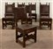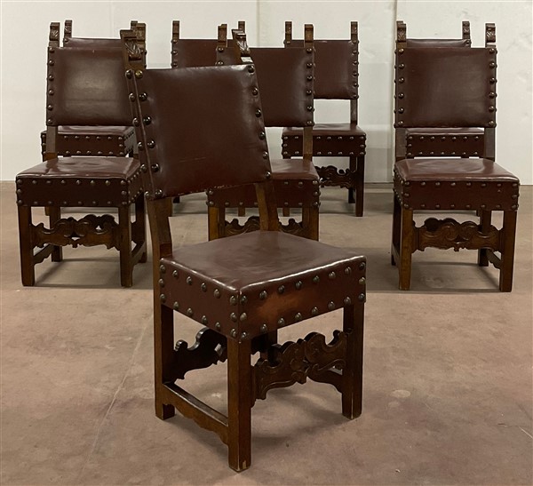 Gruppo di otto sedie in stile rinascimentale con seduta e schienale in pelle bo