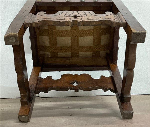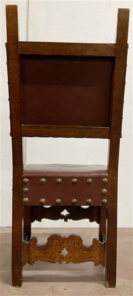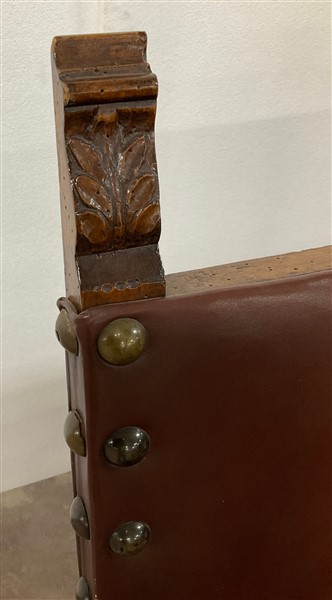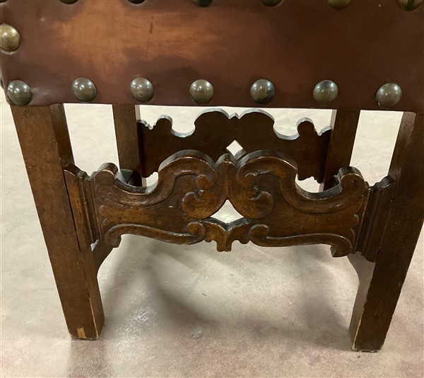 Gruppo di otto sedie in stile rinascimentale con seduta e schienale in pelle borchiata (difetti e mancanze)
