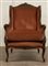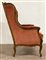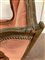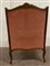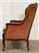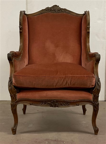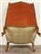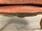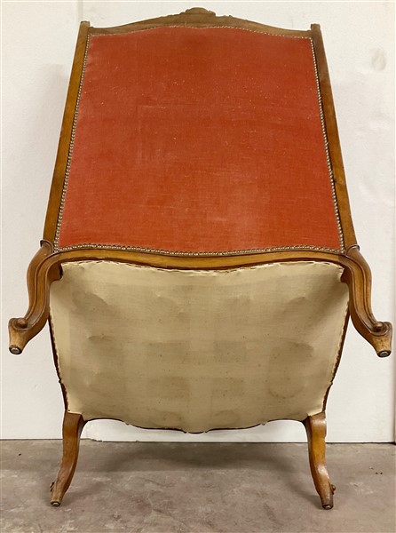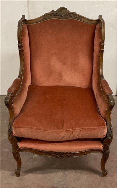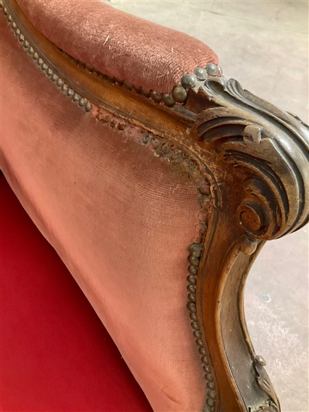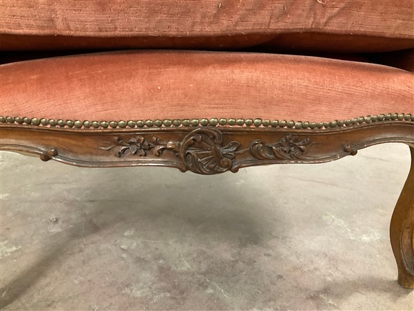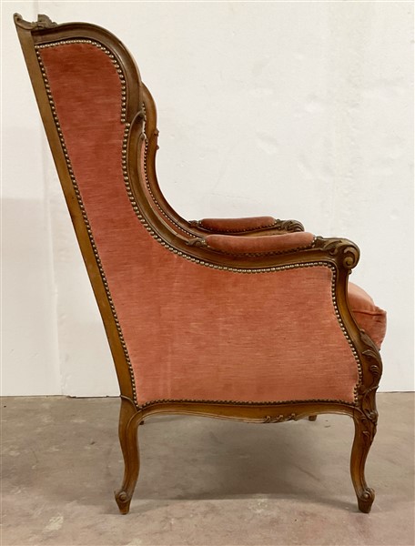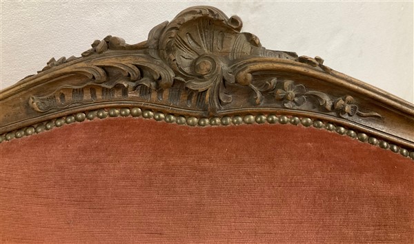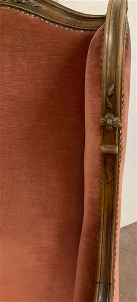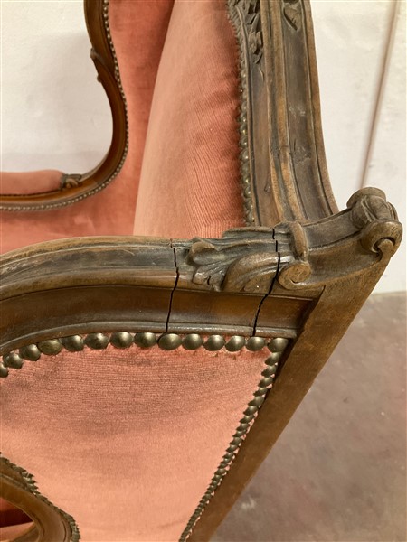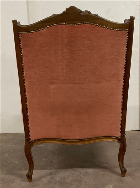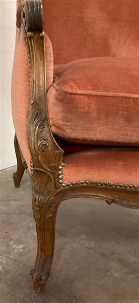 Poltrona in legno intagliato con profili mossi, cuscino e imbottiture rivestite in tessuto color salmone (difetti)