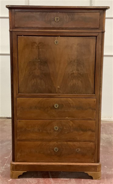Secretaire in legno lastronato con fronte a quattro cassetti e ribalta contenen