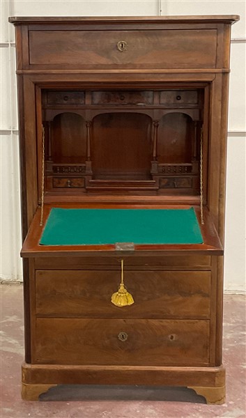 Secretaire in legno lastronato con fronte a quattro cassetti e ribalta contenente scarabattolo con struttura architettonica e cassettini. Secolo XIX (cm 90x159x46) (difetti)