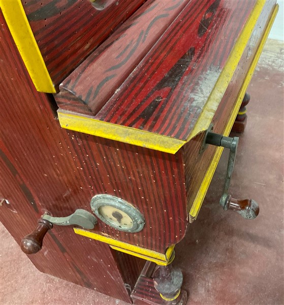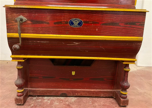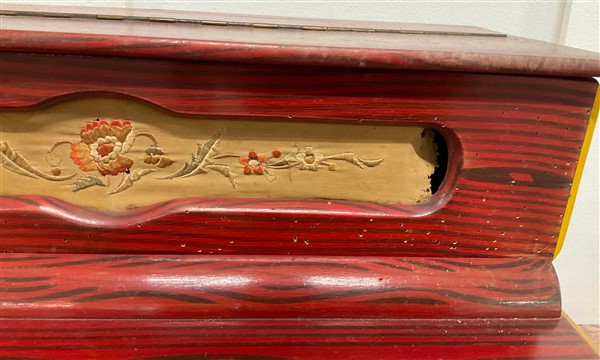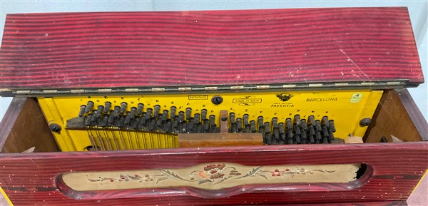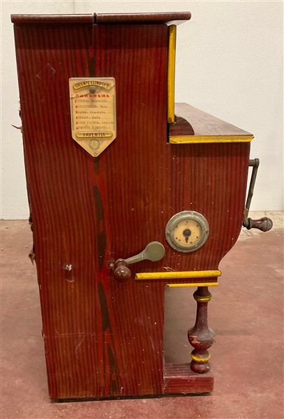 Pianoforte a cilindro di piccole dimensioni corredato da carretto, a sei melodie. Spagna, metà secolo XX (difetti)