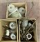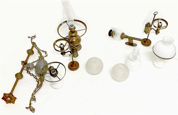 Tre cartoni contenenti parti di lampadari, lampade ad olio in ottone montate a luce elettrica e paralumi in vetro e opaline (difetti e mancanze)