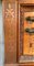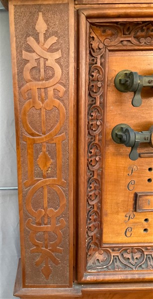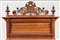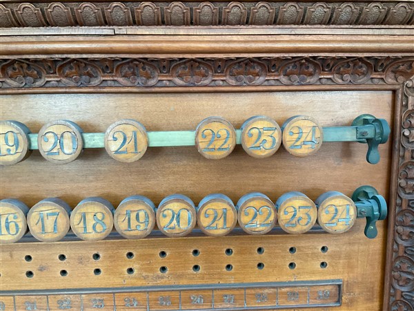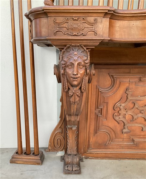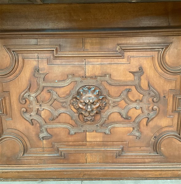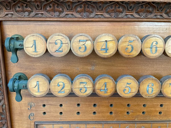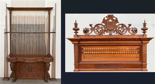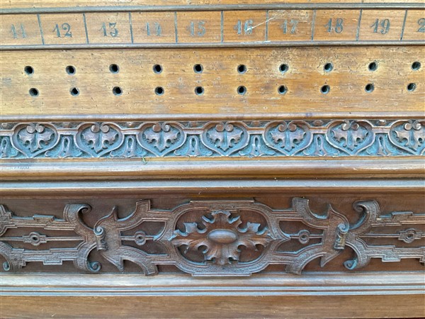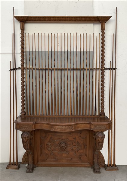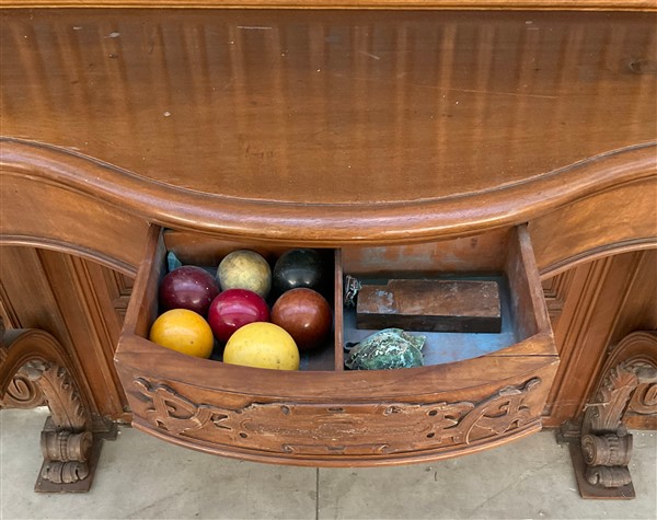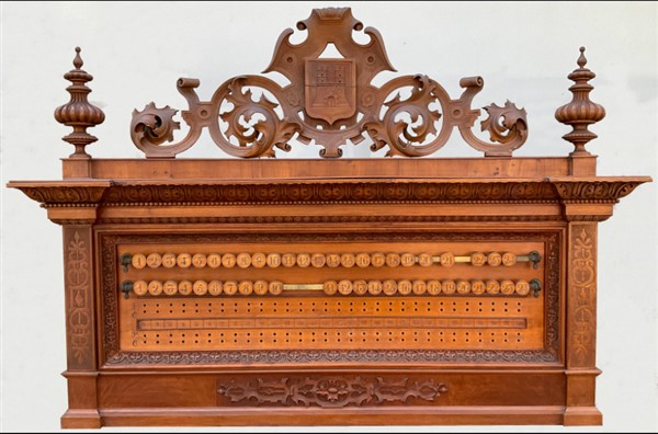 Set da biliardo composto da un mobile porta stecche in mogano di forma sagomata con cassetto nella fascia, montanti intagliati a volute, motivi vegetali e volto muliebre, schienale centrato da testa leonina e fregi a bassorilievo, alzata di struttura architettonica con montanti a tortiglione con portastecche da biliardo completa di stecche di misure diverse, cassetto contenente bocce di vario colore (cm 185x278x51) unita ad un segnapunti intagliato con decoro a volute, cimasa sormontata da stemma araldico. Secolo XIX (cm 168x115) (difetti)