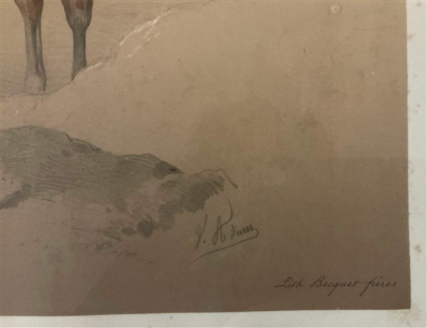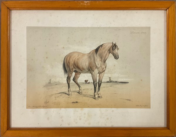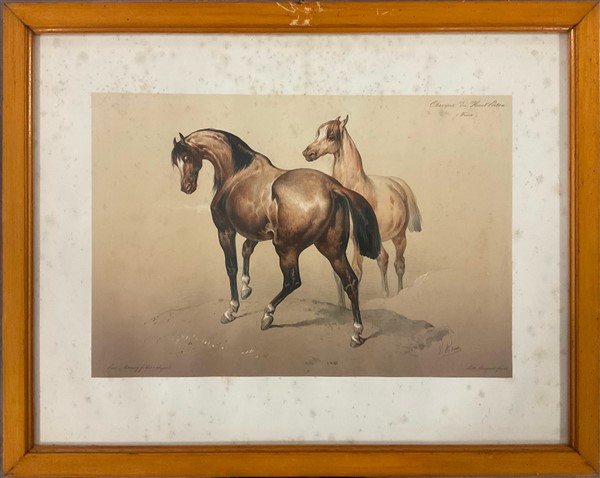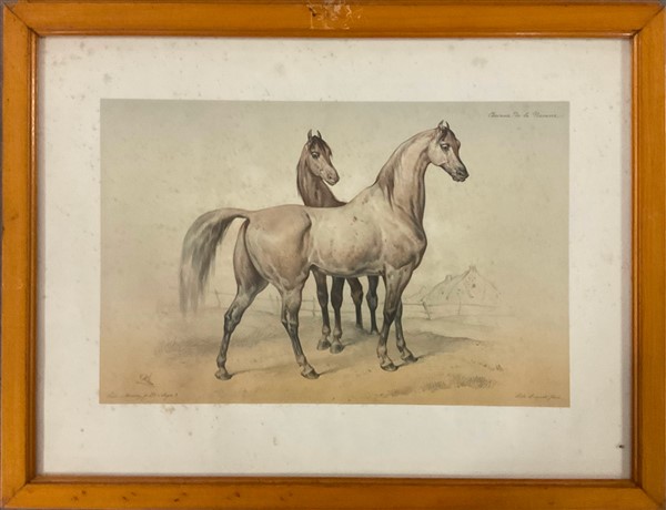 Becquet Freres, secolo XIX. Gruppo di quattro litografie raffiguranti razze equine (cm 42x56) in cornici (difetti)