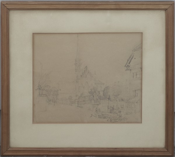 Ignoto del secolo XIX "Veduta di cattedrale" matita nera su carta (mm 305x360 circa). Iscritto in basso a destra "Vue de cathedral...". In cornice