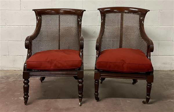 Coppia di poltrone di forma mossa lastronate in mogano, braccioli terminanti a ricciolo, fascia scanalata. Gambe anteriori tornite e posteriori a sciabola munite di rotelle. Schienale e seduta incannucciata. Inghilterra, secolo XIX (cm 57,5x87x56) (lievi difetti)