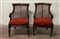Coppia di poltrone di forma mossa lastronate in mogano, braccioli terminanti a