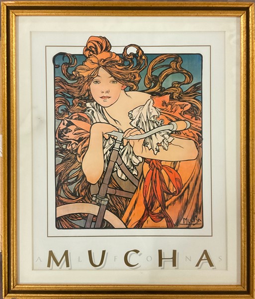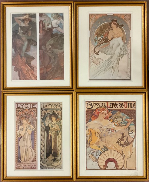 Lotto composto da nove riproduzioni da illustrazioni di Alfonse Mucha, misure diverse in cornici dorate (lievi difetti)