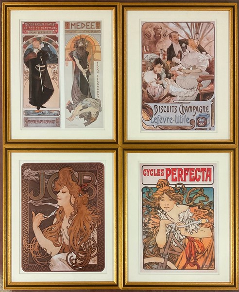Lotto composto da nove riproduzioni da illustrazioni di Alfonse Mucha, misure d