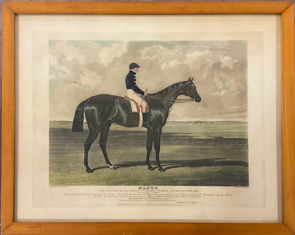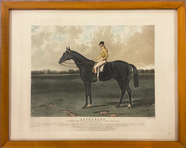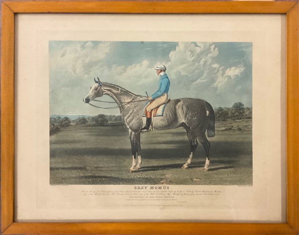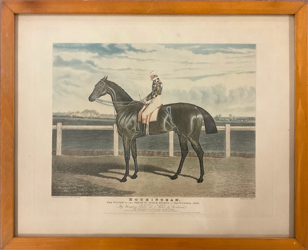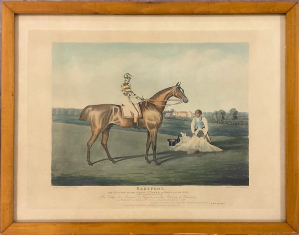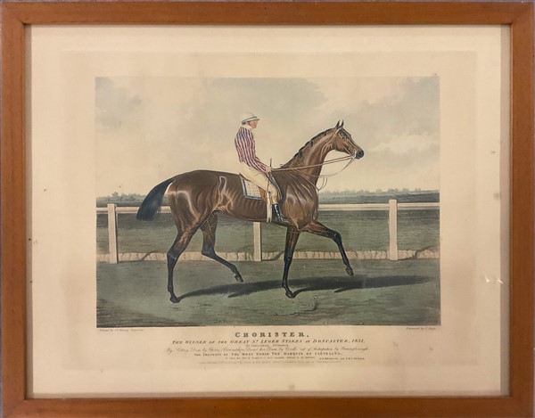 Hunt Sutherland. Gruppo di sei litografie del secolo XIX a colori raffiguranti purosangue con fantini (cm 45x56) in cornice (difetti)