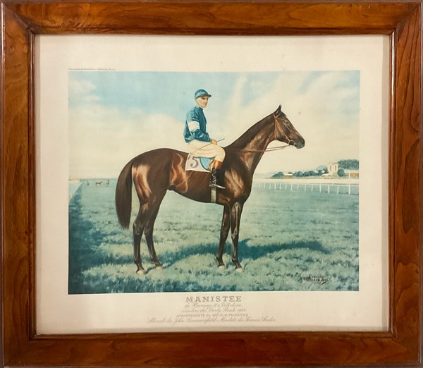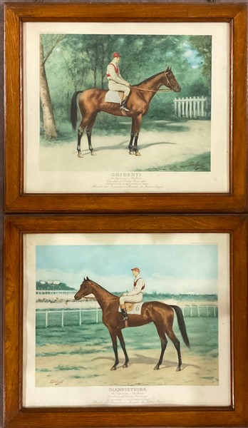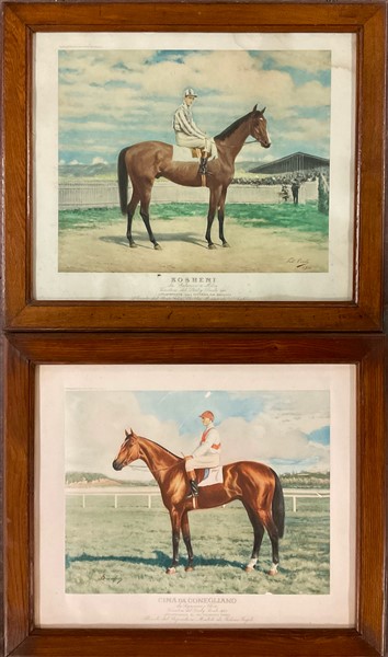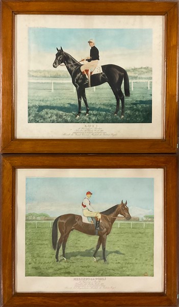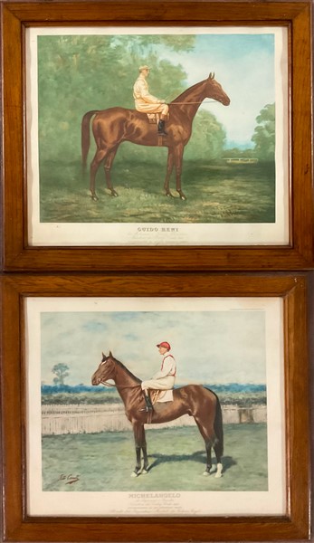Gruppo di nove fotocalcografie a colori raffiguranti cavalli da corsa con fantini (cm 48x57) in cornici in mogano del secolo XX (difetti)