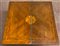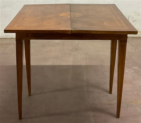 Tavolino da gioco lastronato, intarsiato e filettato in bois de rose con piani centrati da medaglione con fiore. Gambe rastremate (piano chiuso cm 75x73x37) (difetti)
