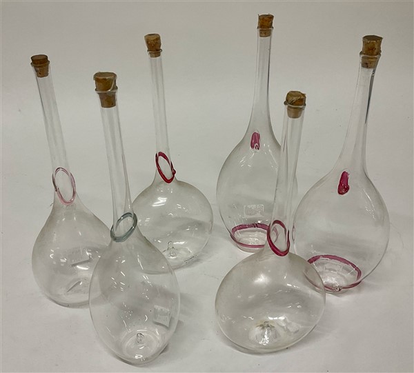 Lotto composto da sei bottiglie di forme differenti in vetro soffiato, con tappo in sughero (difetti)