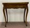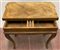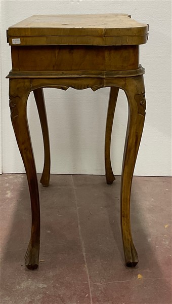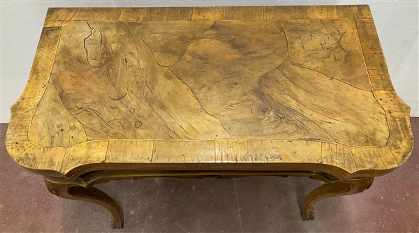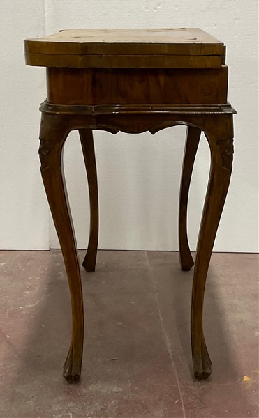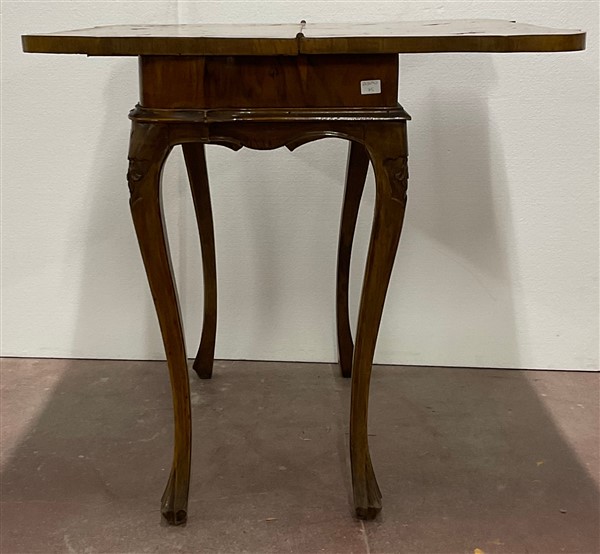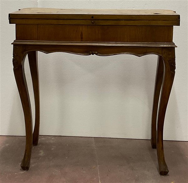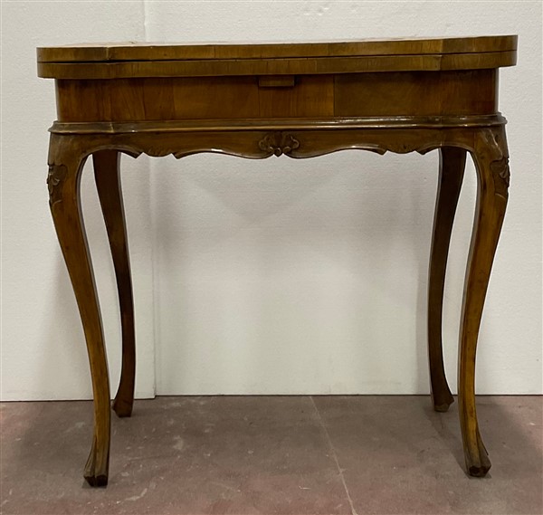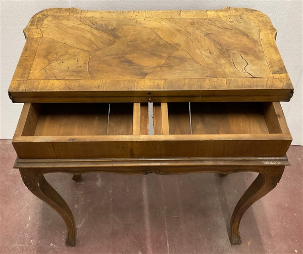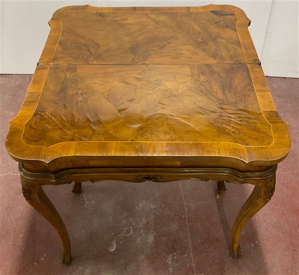 Tavolo da gioco con piano apribile, lastronato in radica e filettato di forma s