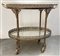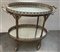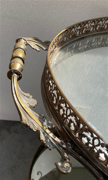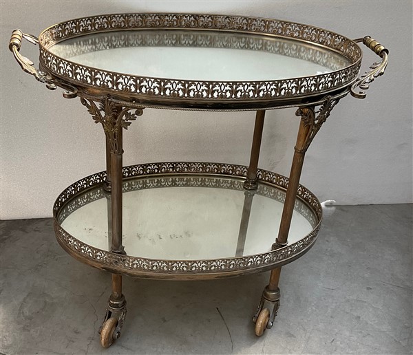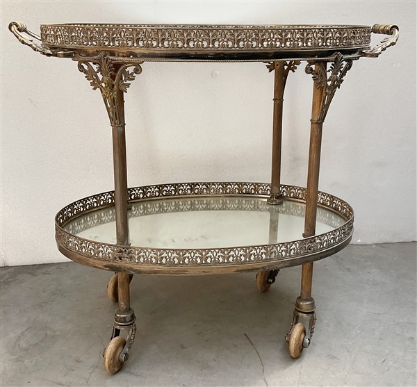 Carrellino porta vivande in metallo argentato con ringhiere traforate e anse fogliate, piani ovali specchiati (cm 86x74,5) (difetti e rotture)