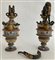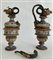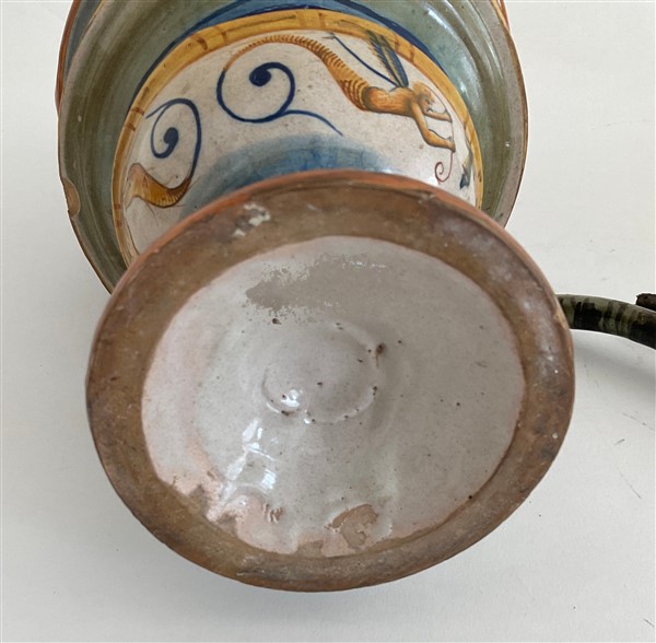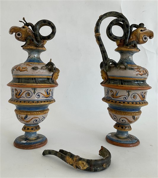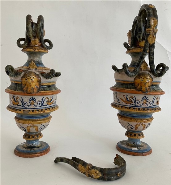 Manifattura dell'Italia centrale. Coppia di versatoi in maiolica a balaustro con anse a serpi e collo a testa di delfino, decorati in policromia a grottesche e putti nello stile urbinate dei Patanazzi (h cm 39) (gravi difetti e rotture)