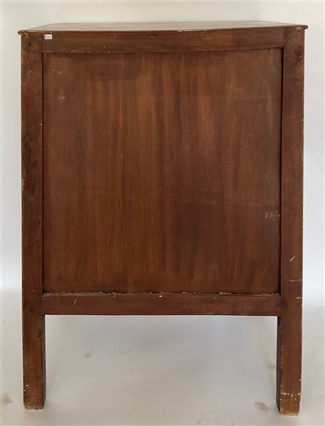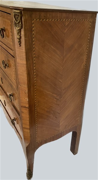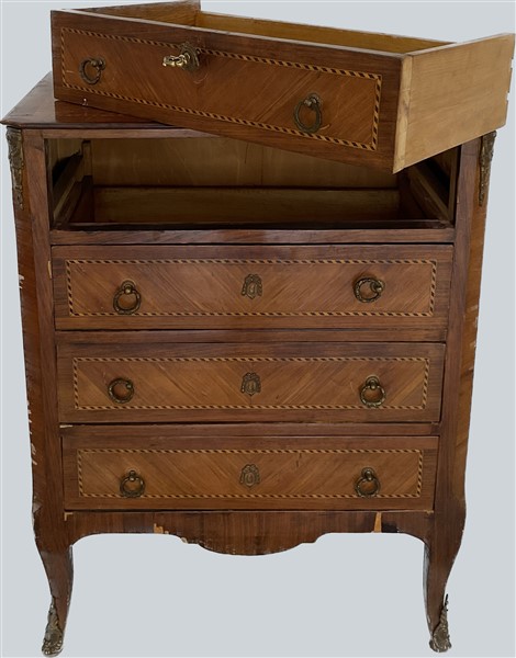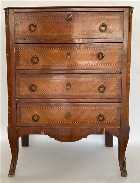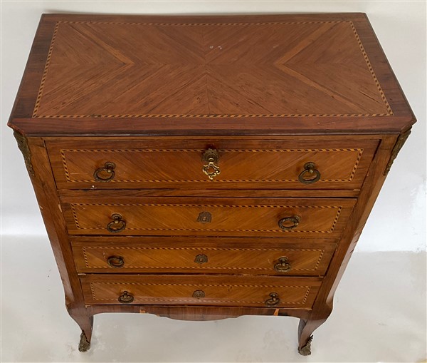 Cassettiera impiallacciata e filettata in legni vari a quattro cassetti sul fro