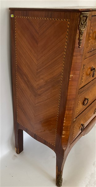 Cassettiera impiallacciata e filettata in legni vari a quattro cassetti sul fronte e piedi mossi (cm 65,5x86x34,5) (difetti e mancanze)