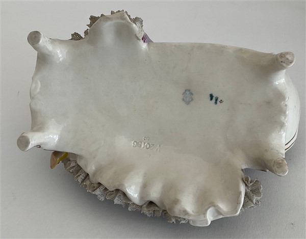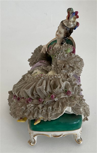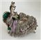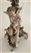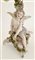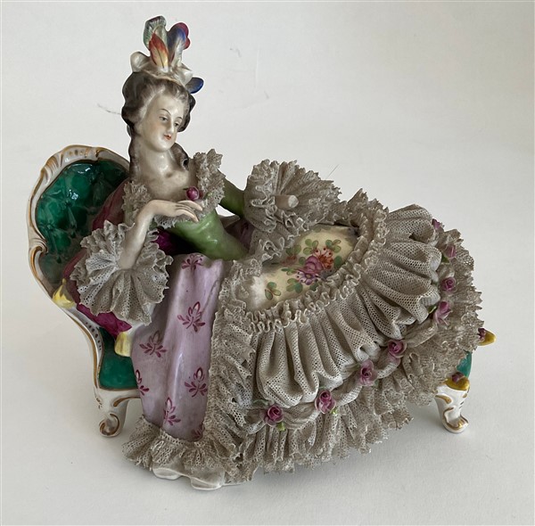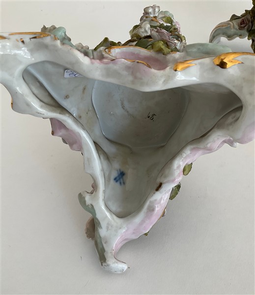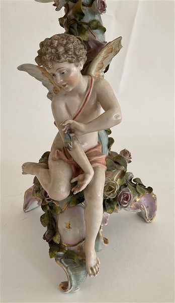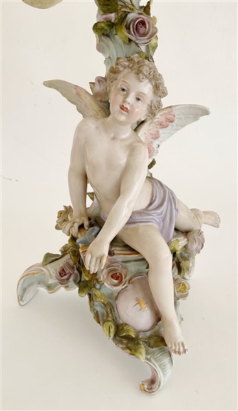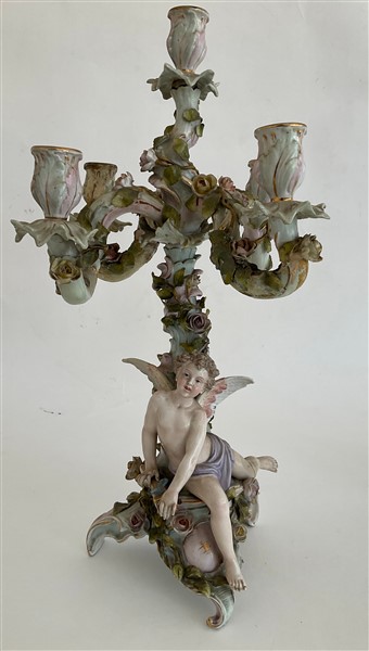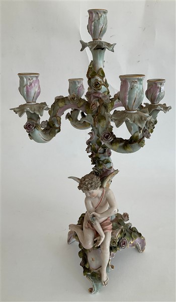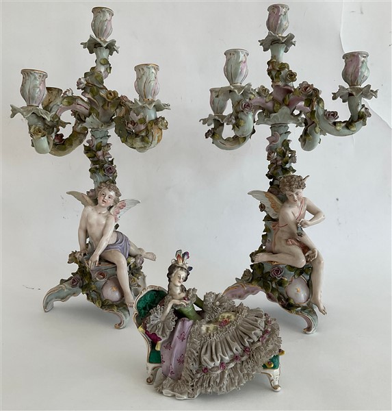 Lotto in porcellana composto da una coppia di candelabri a cinque fiamme con fusto in foggia di angelo poggiante su albero decorato da fiori e bracci a rami fioriti unito ad una figura di dama distesa su dormeuse. Manifatture differenti. (h max cm 51,5)(difetti, rotture e restauri)