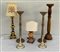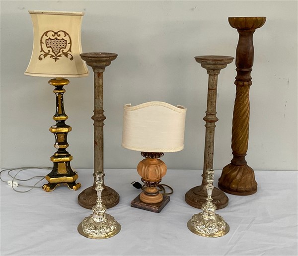 Lotto di cinque torciere in legno intagliato, tornito e laccato (h max cm 76), unite ad una coppia di candelieri in metallo argentato (h cm 22) (difetti)