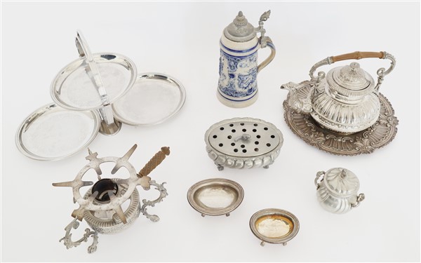 Lot 2460 | Lotto composto da numerosi oggetti in metallo argentato uniti a un boccale (dif