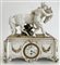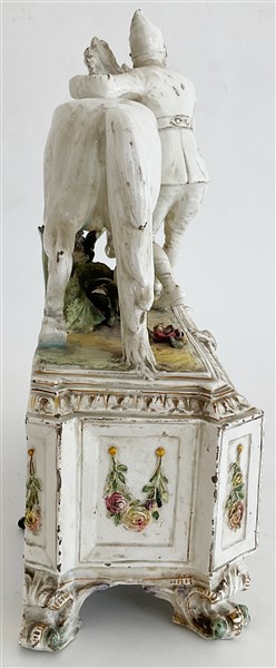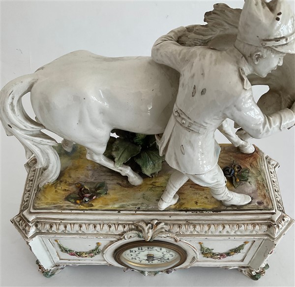 Orologio da appoggio con cassa in ceramica dipinta in policromia sormontata da soldato con cavallo a tutto tondo. Quadrante in smalto bianco a cifre arabe. Ultimo quarto del secolo XIX (cm 30x33) (difetti e mancanze)