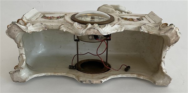 Orologio da appoggio con cassa in ceramica dipinta in policromia sormontata da