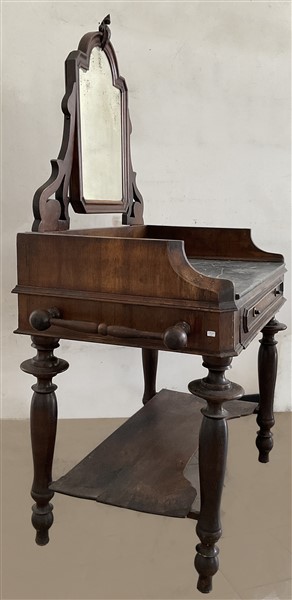 Toilette in noce con fronte a un cassetto e gambe tornite riunite da pianetto, piano in marmo grigio, alzata con specchiera basculante. Inizio secolo XX. (cm 88x138x55) (difetti e mancanze)