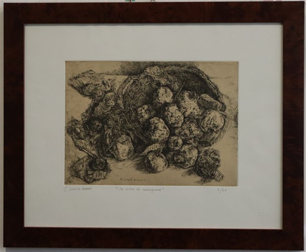 Firma indecifrata "Un cesto di melagrane" acquaforte (foglio cm 39x49) firmata, titolata e numerata 9/40 in basso a matita