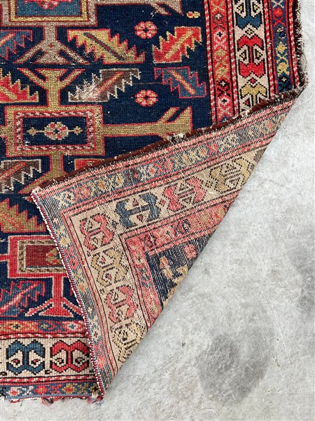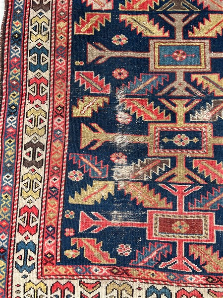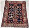 Tappeto Hamadan, Persia, fine secolo XIX. Decoro geometrico in sequenza policromo su fondo blu notte (cm 131x110) (difetti, rapature e mancanze)