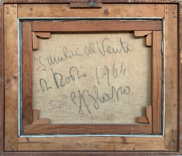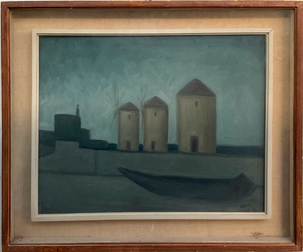 "I mulini a vento a Rodi" 1964, olio su tela (cm 40x50) firmato e datato in basso a destra; titolato, firmato e datato al verso