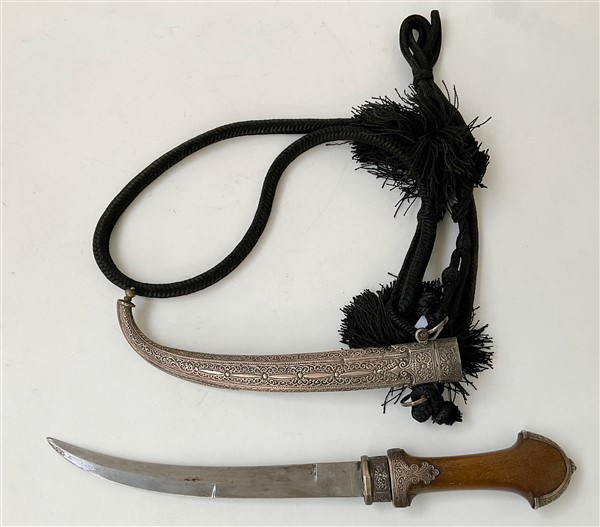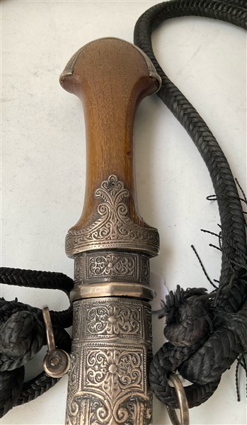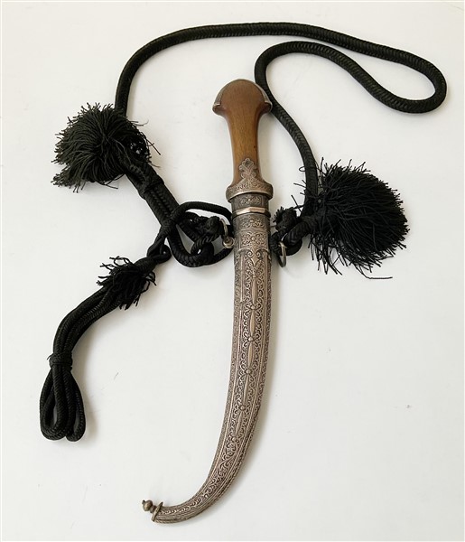 Elegante Kumya, Marocco, secolo XIX. Impugnatura in legno di palma ed inserti in argento cesellati a motivi floreali. Interessante fodero con lavorazioni di cesello e sbalzo. Completa del suo cordone nero intrecciato e arricchito di fiocchi per indossarla (L. cm 40) (difetti)