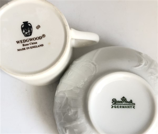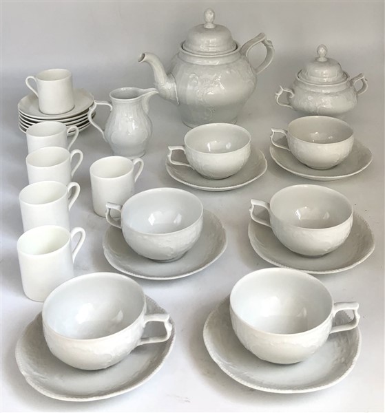 Manifattura diverse: servizio da te in porcellana bianca composto da sei tazze con piattino teiera, zuccheriera e lattiera manifattura di Rosenthal e un set da caffè con sei tazze e piattini in porcellana bianca manifattura Wedgwood (lievi difetti)