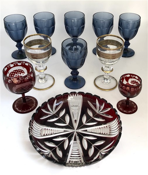 Cartone contenente diversi oggetti in vetro di manifatture e decori diversi, pe