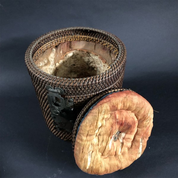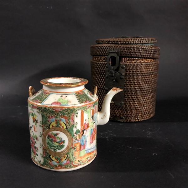 Teiera in porcellana policroma Canton con contenitore per trasporto in midollino