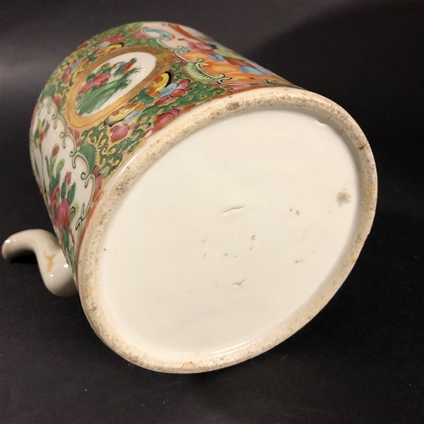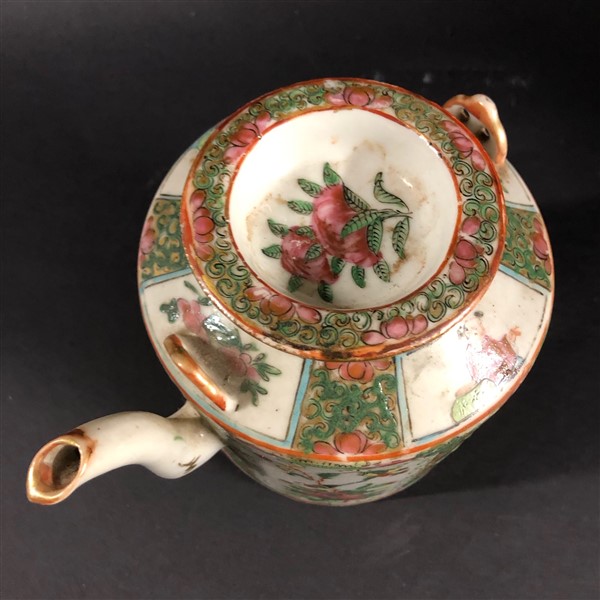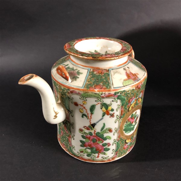 Teiera in porcellana policroma Canton con contenitore per trasporto in midollin