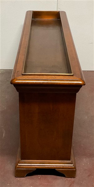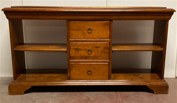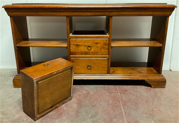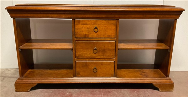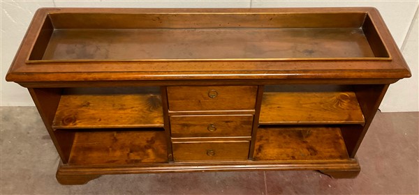 Mobile con fioriera da centro con doppio vano a giorno ad un ripiano e tre cassetti centrali scorrevoli su entrambi i lati. Parte superiore con vasca in rame (cm 148x72x42) (difetti)