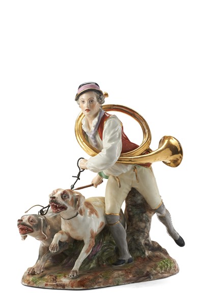 Manifattura di Samson, secolo XIX. Gruppo in porcellana policroma profilata in oro raffigurante cacciatore con corno e cani (cm 32x38) (difetti e restauri)