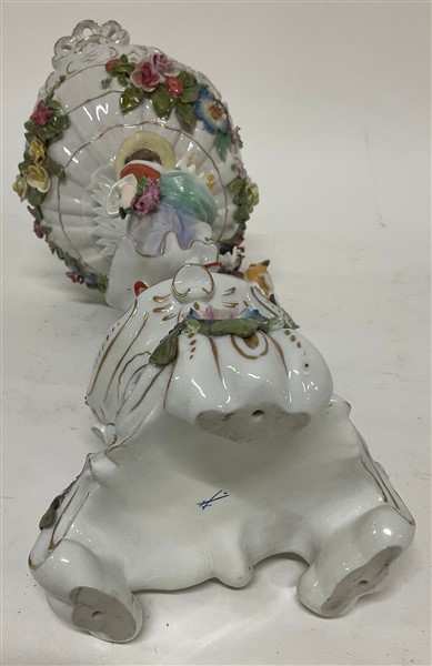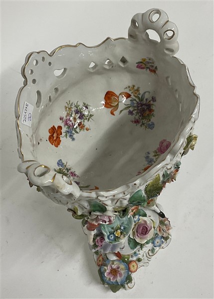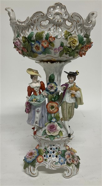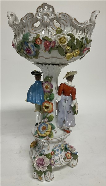 Manifattura tedesca della fine del secolo XIX Centrotavola in porcellana dipinta in policromia a coppa traforata, fusto a figure a tutto tondo e decoro a foglie e fiori (cm 22x40) (difetti)