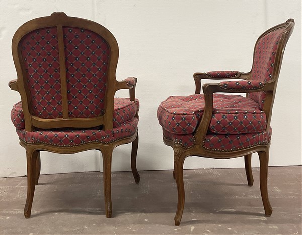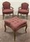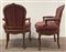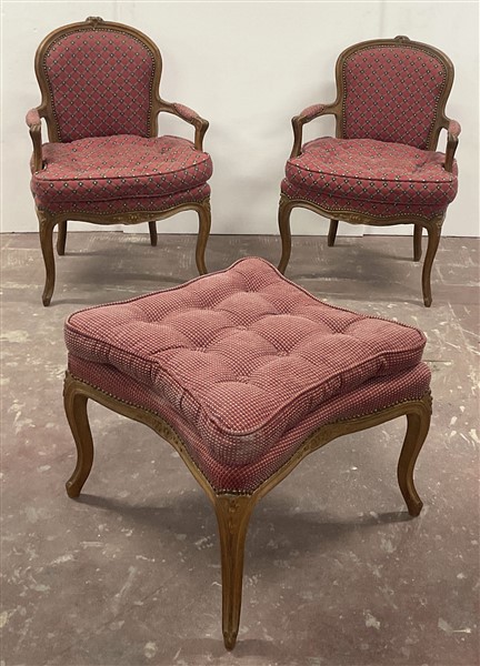 Coppia di poltrone di forma mossa in legno intagliato con schienale, braccioli e gambe scanalate, fascia decorata a fiori, unite ad un poggiapiedi di simil decoro (difetti)