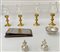 Lotto composto da quattro portacandele in ottone dorato con paralume in vetro, un porta blocknotes in legno e metallo argentato, due tappi e una ciotola in metallo argentato (h. max cm 28) (difetti)