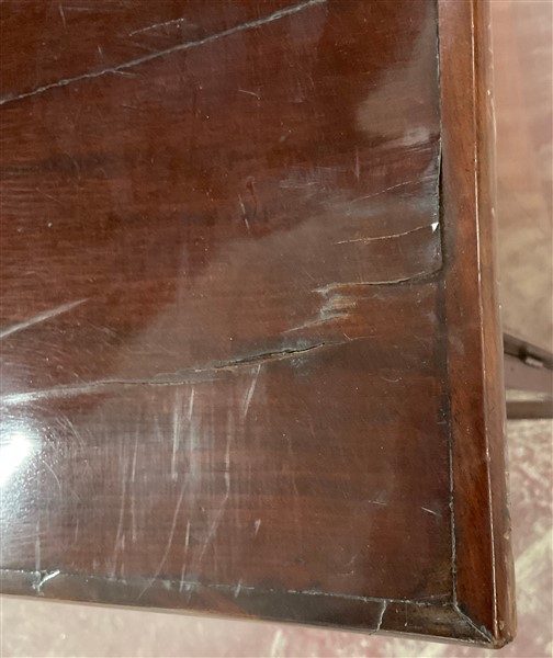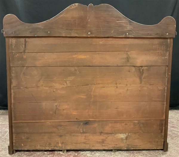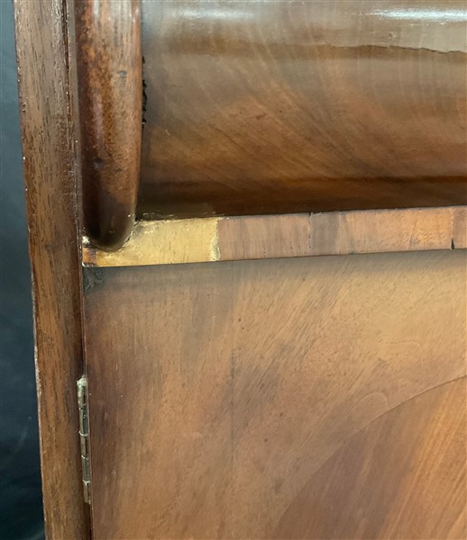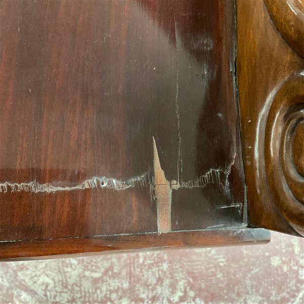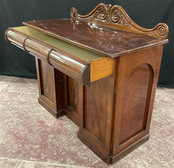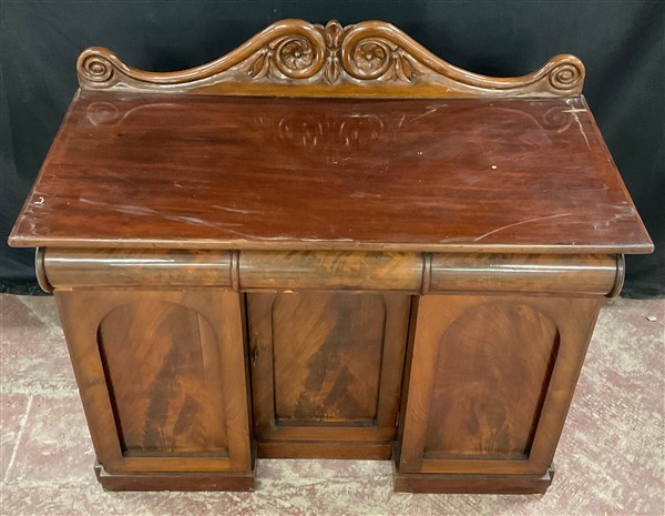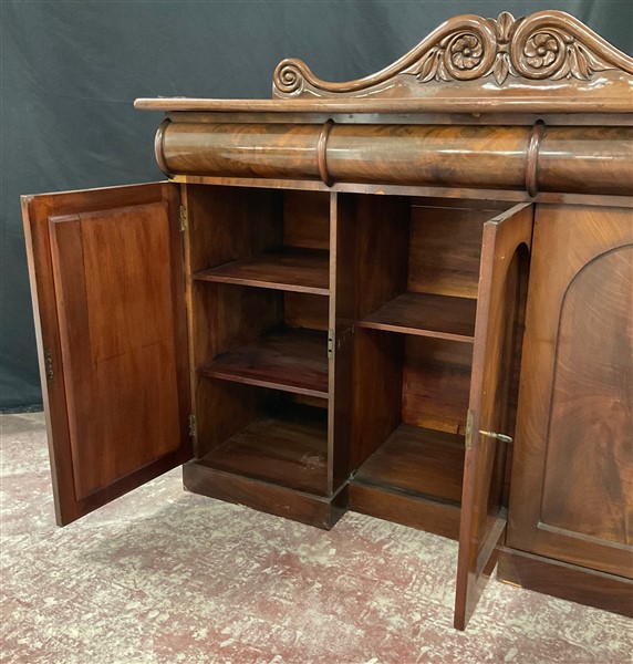 Sideboard in mogano e piuma di mogano con fronte concavo a tre ante con ripiani interni, cassetto sottopiano con dorso ricurvo e sagomette in rilievo, decorato ad archi rientranti sulle ante e sui fianchi. Alzata del piano intagliata a rosoni e sagomata a volute. Inghilterra, secolo XIX (cm 113x111x57) (difetti e rotture del lastrone sul piano)