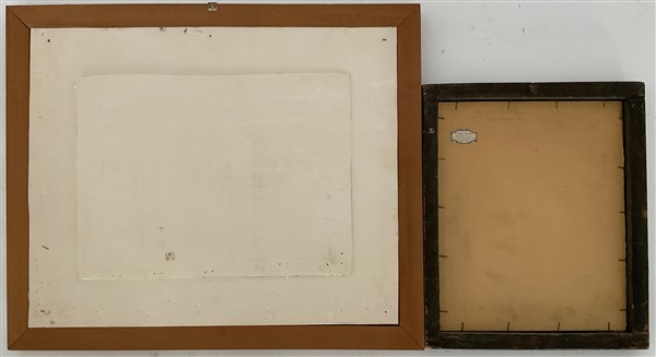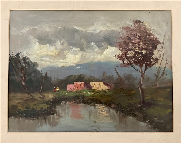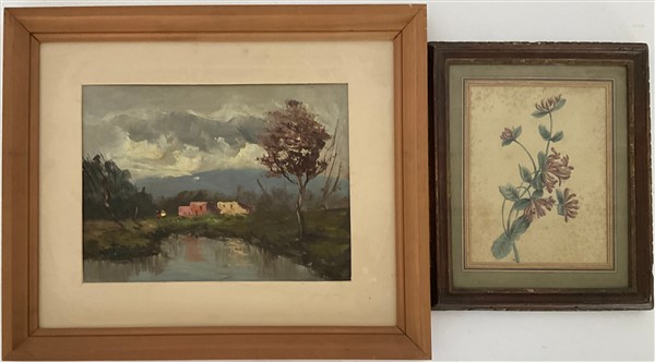 Lotto composto da un dipinto raffigurante fiori ed un olio su compensato raffigurante un paesaggio, misure diverse in cornici (difetti)