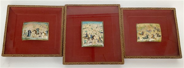 Arte persiana. Lotto di tre placche dipinte su madreperla raffiguranti scene di