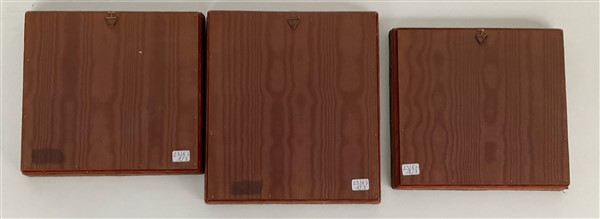 Arte persiana. Lotto di tre placche dipinte su madreperla raffiguranti scene di vita, misure diverse, in cornici a teca (cm 19x17.5 compresa cornice) (difetti)