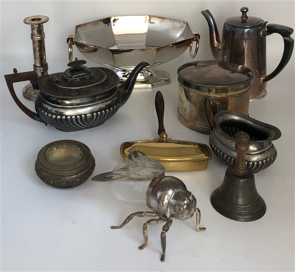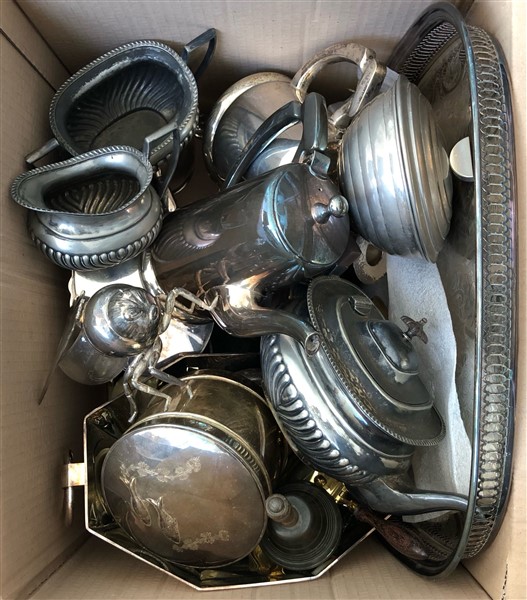 Lot 2608 | Cartone contenente numerosi oggetti in metallo argentato e altri materiali di u