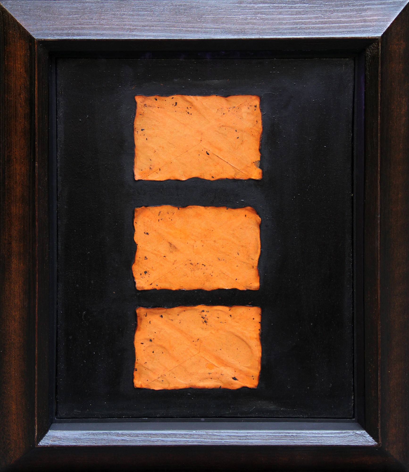 Collage di buste, 1961, collage di carta bruciata e pittura su tela, cm 50x40